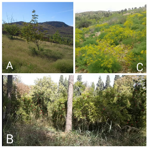 Figs. 2. Habitats of collected flies: A: Dalin, B: Shiraz, Jannat garden, C: Dasht–e Arzhan