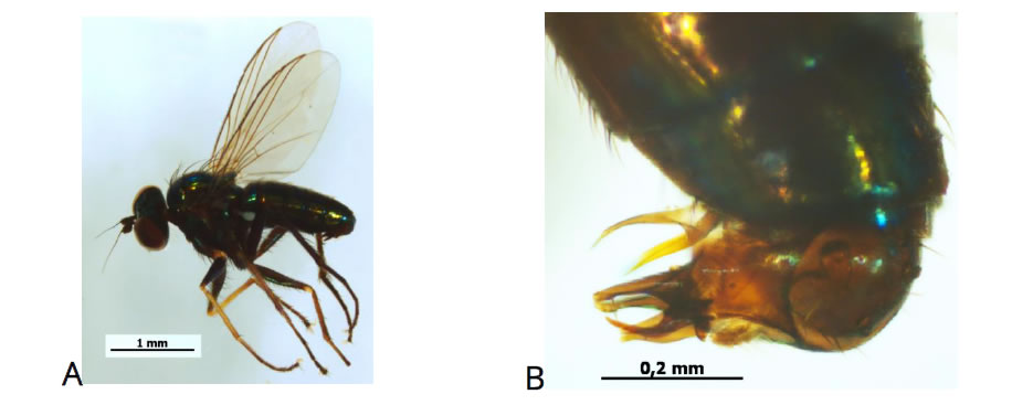 Figs. 5. Sciapus adumbratus (Becker, 1902): A-male habitus; B-hypopygium.