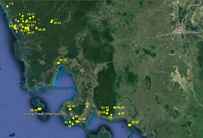 Fig. 1. Disposition of localities where butterfly photos were taken in the coastal provinces of Cambodia. The numerals correspond to those used for the localities in the text.