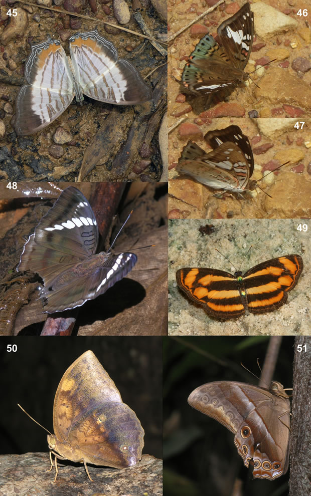 Lasippa tiga siaka (Moore, 1881) §§ – PS: 46\Amphicnemis Rivulet, 27.03.2015 (Fig. 49). The range of two subspecies, L. t. siaka and L. tiga camboja (Moore, 1879), are shown by Inayoshi (2018) as overlapping in continental Thailand, that is impossible. Most probably the taxon camboja is rather bona species than conspecific to L. tiga, as assumed by Ek-Amnuay (2006). The photographed butterfly corresponds to the taxon L. t. siaka, which has not been reported for Cambodia, while camboja has (Inayoshi, 2018).