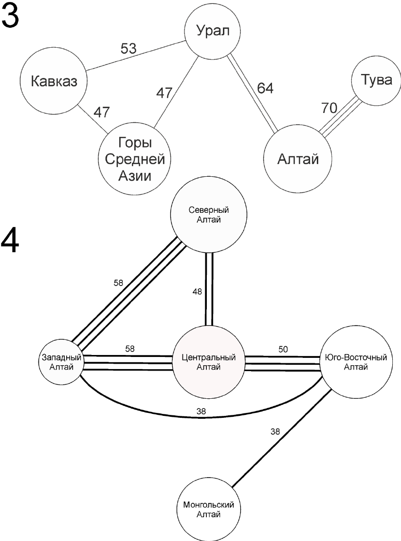 Рис. 3– 4. Графы, иллюстрирующие степень сходства фаун Gnaphosidae различных горных систем Северной Евразии (3) и различных регионов Алтая между собой (4). Степень сходства выражена в процентах.