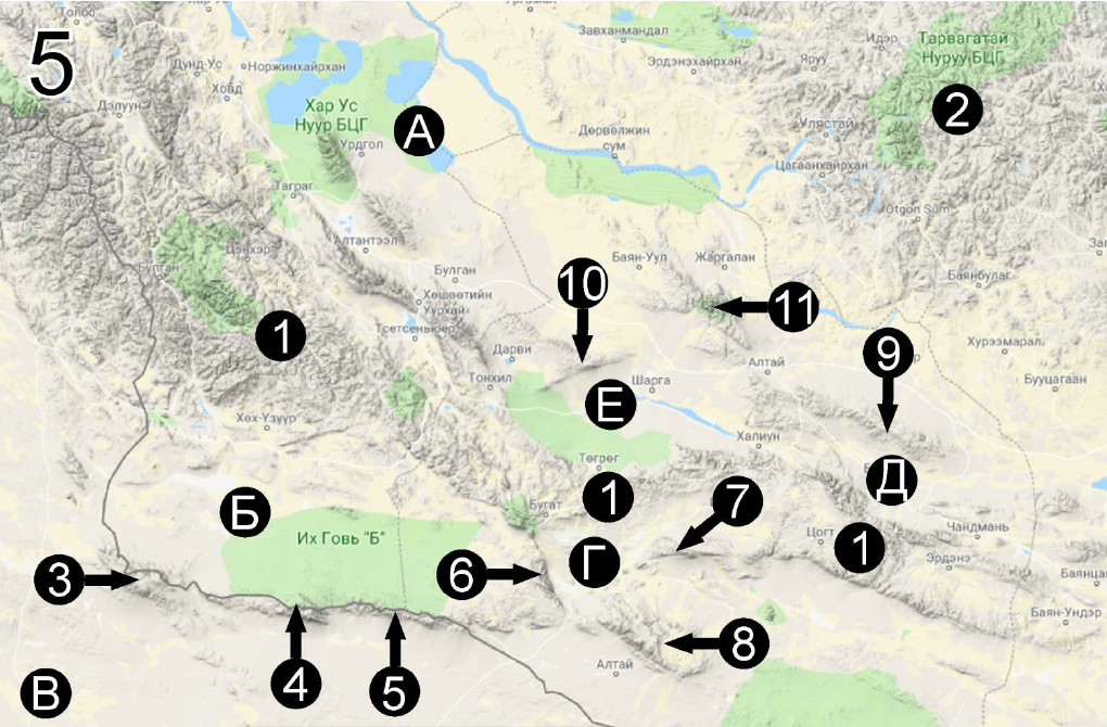 Рис. 5. Основные элементы орографии южной части Монгольского Алтая. 1 –основной массив Монгольского Алтая, 2–нагорье Хангай (не относится к Монгольскому Алтаю), 3–хребет Байтаг - Богд - Уул, 4–хребет Их - Хавтаг - Уул, 5 –хребет Тахийн - Шар - Нуруу, 6 – хребет Хувчийн - Нуруу, 7–хребет Их - Таянгийн - Нуруу, 8–горный массив Адж - Богд, 9 –хребет Шороотын - Нуруу, 10–хребет Дарвийн - Нуруу, 11 – хребет Хасагтын - Нуруу; А–котловина Больших Озёр, Б– котловина Барун - Хурай, В–котловина Лоемё - Гоби, Г–Алаг - Нурская впадина, Д–Бэгэрская впадина, Е–котловина Шаргын - Гоби.