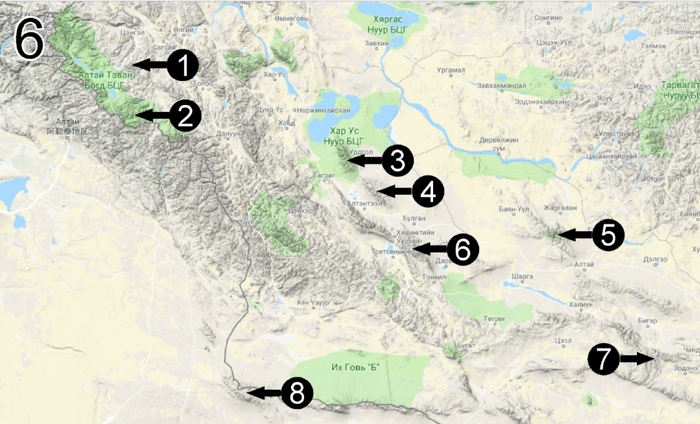Рис. 6. Узколокальный высокогорный эндемизм у пауков - Гнафозид рода Parasyrisca и пауков - волков родов Acantholycosa и Mongolicosa в Монгольском Алтае. 1–северная часть хребта Цэнгэл - Хайрхан - Нуруу (Parasyrisca sp. No 3 , M. cherepanovi); 2 –южная часть хребта Цэнгэл - Хайрхан - Нуруу (P. kosachevi); 3 –хребет Джаргалант - Хайрхан (P. tronovorum, M. uncia); 4 –хребет Бумбат - Хайран - Богд (Parasyrisca sp. No 1, M. ozkutuki); 5 –хребет Хасагтын - Нуруу (Parasyrisca sp. No 2, A. kronestedti); 6 – хребет Сутай - Уул (M. azarkinae); 7 –хребет Цахир - Хаалгын - Нуруу (A. vahterae); 8 –хребет Байтаг - Богд - Уул (M. przhewalskii ).