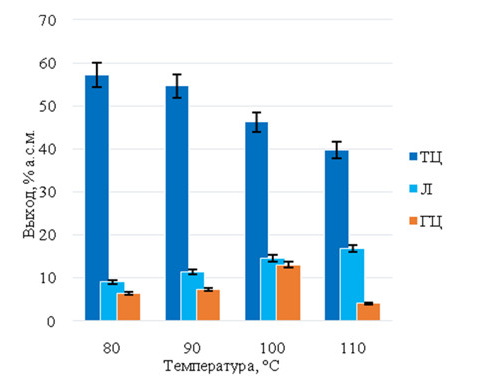 Представлены результаты исследования возможности применения глубокого эвтектического растворителя на основе триэтиламин гидрохлорида как способа подготовки соломы пшеницы для ферментативного гидролиза. Термообработка соломы в среде триэтиламин гидрохлорид/щавелевая кислота осуществлялась в интервале температур 80–110 °С. При фракционировании полученной смеси продуктов были выделены фракции технической целлюлозы, гемицеллюлоз и лигнина. Результаты анализа компонентного состава и ИК-спектров фракций технической целлюлозы свидетельствуют об интенсивном протекании процессов делигнификации и гидролиза гемицеллюлоз при термообработке. Максимальная степень делигнификации соломы (94.5%) получена при температуре 110 °С, при этом содержание целлюлозы в составе технической целлюлозы составило 91.2% а.с.м. Установлено, что обработка соломы пшеницы в среде триэтиламин гидрохлорид/щавелевая кислота эффективна в качестве подготовительного этапа для ферментативного гидролиза. Максимальный выход сахаров зафиксирован при 48 ч ферментолизе фракции ТЦ/110 °С – 27% а.с.м., что превышает выход сахаров из исходной соломы в три раза.